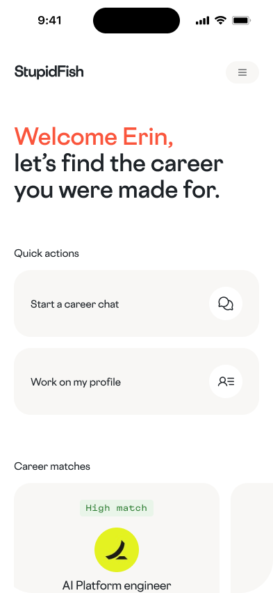 StupidFish helps you find best-fit career paths and gives you a practical plan and 24/7 coaching to get you hired.